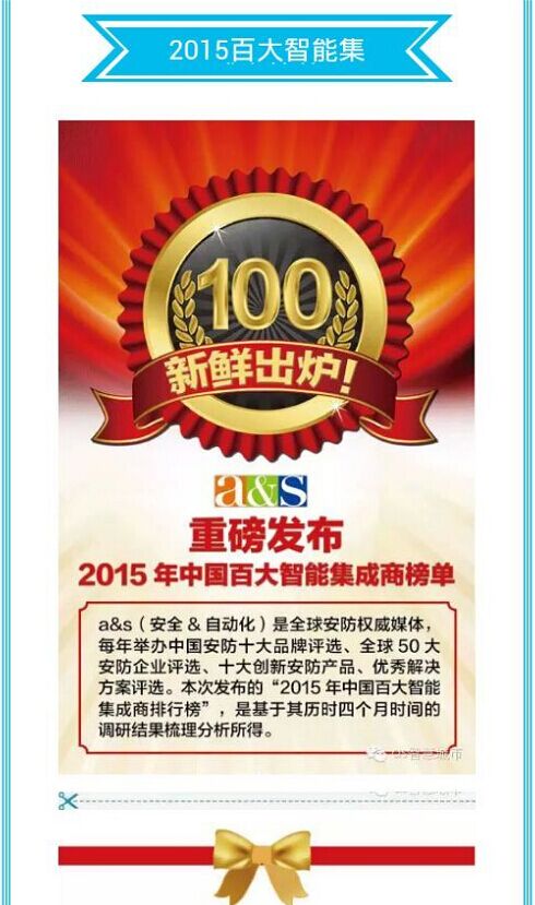 由安全&自動(dòng)化雜志承辦,工信部下屬中國(guó)電子學(xué)會(huì)信息系統(tǒng)集成分會(huì)主辦的第一屆百大智慧安防集成商評(píng)選活動(dòng),吸引了來(lái)自智能化產(chǎn)業(yè)的超過(guò)200位高端嘉賓參會(huì),包括政府部門(mén)、國(guó)內(nèi)外知名智能化企業(yè)以及智能化產(chǎn)業(yè)的專家、學(xué)者、企業(yè)高管、技術(shù)總監(jiān)等,經(jīng)過(guò)長(zhǎng)達(dá)4個(gè)月的角逐,我公司從評(píng)選活動(dòng)的6萬(wàn)名智能集成商中脫穎而出,獲得“2015中國(guó)百大智能集成企業(yè)”的榮譽(yù) 。a&s(安全&自動(dòng)化)是全球安防權(quán)威媒體,每年舉辦全國(guó)安防十大品牌評(píng)選、全球50大安防品牌評(píng)選、十大創(chuàng)新安防產(chǎn)品、優(yōu)秀解決方案評(píng)選。本次發(fā)布的“2015年中國(guó)百大集成商排行榜”是經(jīng)過(guò)四個(gè)月調(diào)研結(jié)果梳理分析所得。