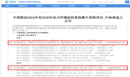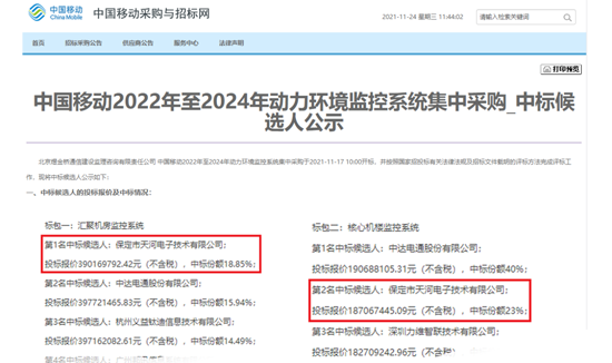 近日,保定市天河電子技術(shù)有限公司以兩個(gè)第二名的優(yōu)異成績,成功中標(biāo)中國移動(dòng)2024-2026年動(dòng)力環(huán)境監(jiān)控系統(tǒng)集采項(xiàng)目的匯聚機(jī)房與核心機(jī)樓雙標(biāo)段。